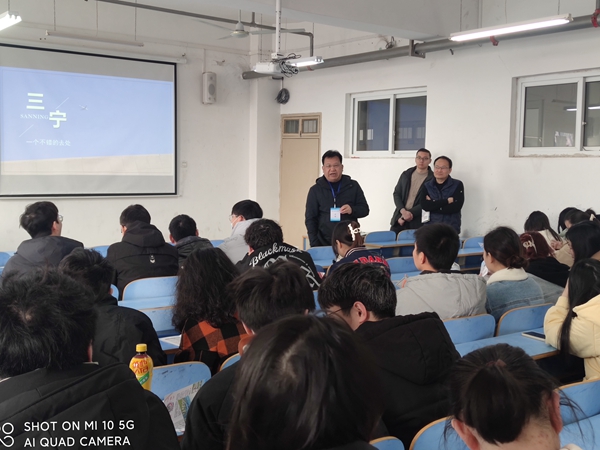 2月27日,湖北三宁化工股份有限公司2023年校园招聘会在崇文楼A804举行,公司领导及毕业班辅导员参加了活动。经理孙勇代表公司对三宁化工一行的到来表示热烈欢迎,对就业工作提出了要求;该企业人事经理赵中华介绍了公司基本情况、企业文化、公司发展平台和福利、岗位需求等;去年入职优秀员工、学院2022届毕业生李继承介绍了一年来在公司的工作、生活及个人体会;公司党总支书记龙德清对本次校园招聘活动给予了指导;院党总支副书记唐传球对毕业生进行就业观教育和引导。宣讲会后,共有10多位同学们积极投递个人简历,并进行了现场面试。