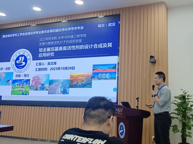 28日上午,组委会邀请了武汉大学、华中科技大学、华中师范大学等国内知名专家学者作了应用化学学科前沿研究进展报告。下午,来自湖北省高校的50余位师生分享了个人研究成果。公司吴文海博士应邀作了“短全氟烷基表面活性剂的设计合成及其应用研究”的主题汇报。