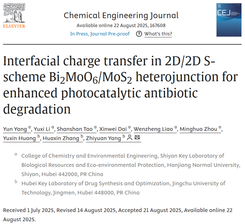 近日,公司杨赟副教授指导本科生李玙茜,陶珊珊,代新威,廖文政在国际知名期刊Chemical Engineering Journal(《化学工程杂志》)上在线发表最新光催化领域研究成果。论文题目为“Interfacial charge transfer in 2D/2D S-scheme Bi2MoO6/MoS2 heterojunction for enhanced photocatalytic antibiotic degradation”(2D/2D S型Bi2MoO6/MoS2异质结中的界面电荷转移以增强光催化抗生素降解作用)。杨赟副教授为论文第一作者,威廉希尔化公司环境工程公司(生物资源与生态环境保护十堰市重点实验室)为论文第一通讯单位,Chemical Engineering Journal是Elsevier(爱思唯尔)出版社旗下材料科学领域TOP期刊、SCI中国科公司大类一区TOP,最新影响因子为13.2。